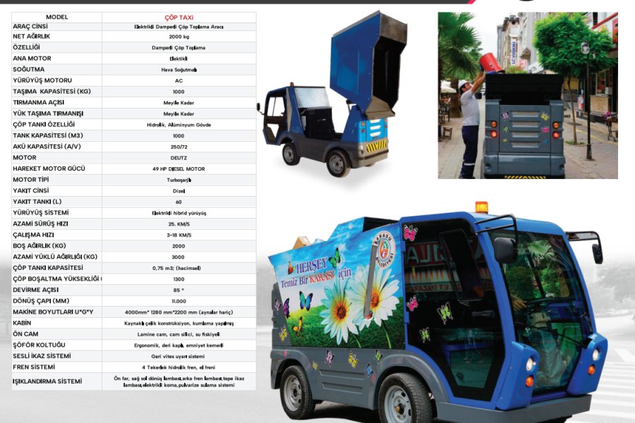 Motor Gücü72V 15 kW ACTipiCT 1750 %100 ELEKTRİKLİAraç ÖzelliğiElektrikli Damperli Çöp Toplama AracıNet Ağırlığı1850 KgYürüyüş - Sürüş MotoruACAna MotorElektrikliAna Motor SoğutmasıHava SoğutmalıTaşıma Kapasitesi1250 KGTırmanma DerecesiASGARİ +%20 MEYİL TIRMANMA KAPASİTESİNDEYük Taşıma DerecesiDÜZ YOLDA VE +%20 MEYİL TIRMANMA ESNASINDAAkü Şarj Süresi8 Saat / Aküler tamamen boşkenÇöp Tank ÖzellikHİDROLİK KALDIRMALI, ALÜMİNYUM GÖVDELİDireksiyonElektrikli DireksiyonAkü Kapasitesi72V 400A TRAKSİYONER AKÜTemiz Su Tank Kapasitesi150 LTÇöp Tank Kapasitesi1,75 m3Yüksek Basınç Su Pompası100 BarUzunluk3600 mmYükseklik2000 mmGenişlik1200 mmÇalışma Hızı0-30 km/saatSürüş Hızı0-30 km/saatLastik Ebatı175-65-14Araç Kullanım Süresi8 Saat